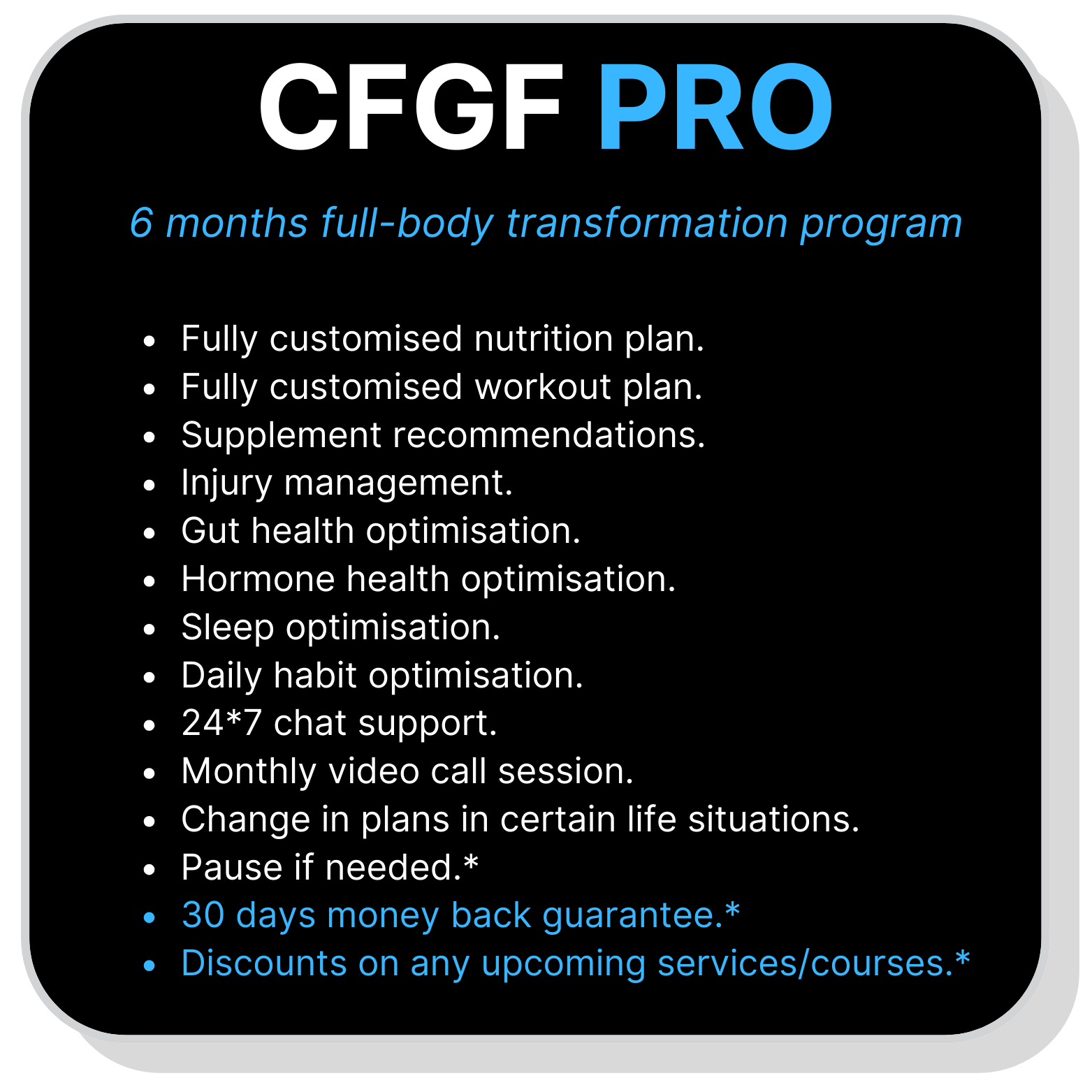 CFGF PROTOCOL is the ultimate science based transformation system which focuses on CUTTING your excess body FAT and thereby GETTING FIT. But you will also be BUILDING MUSCLES along the way. We use 100% evidence based DIET and TRAINING protocols backed by the latest evidences of exercise science and nutrition.